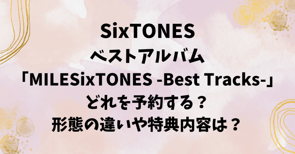 SixTONES初のベストアルバム「MILESixTONES -Best Tracks-(マイルストーンズ ベストトラックス)」の発売が決定しました! 今回のアルバムは初回盤や通常盤など、形態が3種類あり、初のベストアルバムということもあってそれぞれ内容が盛りだくさんで、どれを買うか迷う方も多いのではないでしょうか。 また、予約方法やお得に買えるショップも知りたいですよね? そこで、SixTONESベストアルバム「MILESixTONES -Best Tracks-」の形態ごとの違いや、販売店の情報などまとめましたので、ぜひ最後まで読んでいって... -