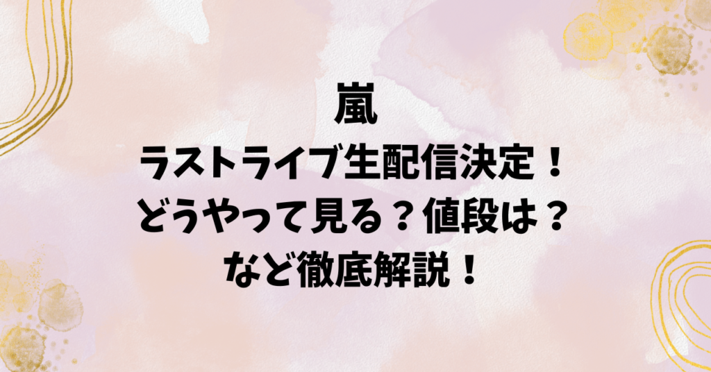 今年の5月31日で活動を終了する嵐。 現在、ラストライブツアーの真っ最中です。 そんな中、オーラスの5月31日公演の中が決定しました! チケットが取れなかった方や、ファンクラブに入っていなかった人も嵐のラストライブを見れることになります! でも、どうやって見れるの?ファンクラブに入っていないけど大丈夫?値段は?といった疑問を持っている方も多いのではないでしょうか? そこで、嵐のラストライブを見る方法や価格についてどこよりも詳しく解説していきます! 嵐のラストライブの配信を見たいという... -
